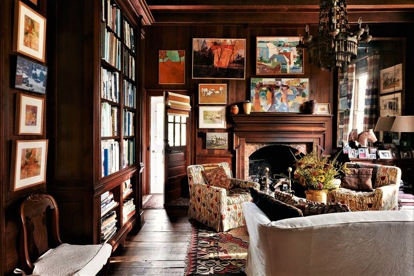 The library of artist Anne Massie’s house is cosy and eclectic. While patterned chairs, lots of paintings and a gorgeous rug add colour and visual interest to the wood panelled room; the grand bookshelf is the real star of the show!